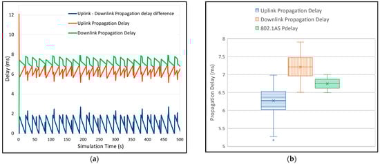 Figure 4b shows the box plot of the uplink and downlink delay as well as the actual propagation delay calculated by the 802.1AS model. From Figure 4, it can be seen that the maximum difference between uplink and downlink propagation delay is approx. ~2 ms. If this difference is considered in the propagation delay calculation, the time difference between TSN device 2 and the Master, after synchronization, reduces to ~0.4 ms at maximum (see Figure 3—TSN device 2 clock time (adjusted)), which is still quite high. The variability of the time difference can be explained by the variability of the uplink and the downlink propagation delay, as seen in Figure 4.