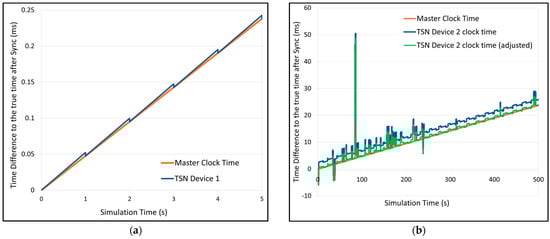 Time differences to the true time after synchronization for TSN Master, (a) for TSN device 1, and (b) for TSN device 2.