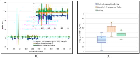 (a) Uplink and downlink propagation delay during PDelay measurements; (b) 802.1AS calculated PDelay compared to uplink and downlink propagation delay during synchronization process (outliers excluded).