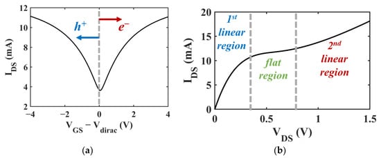 (a) Simulated transfer curve of a generic GFET. The left branch before the minimum conductivity point (VGS = Vdirac) corresponds to a p-type charge transport; the right branch corresponds to an n-type charge transport. Operating the GFET around the Vdirac allows doubling the frequency of the gate signal at the device drain terminal. (b) Simulated static I/O curve of a generic GFET. The static characteristic of this device shows a flat region in the VDS range corresponding to the minimum charge density point entering the channel, determining the charge polarity inversion in the channel. The first linear region of the curve is related to hole conduction, and the second to electron conduction.