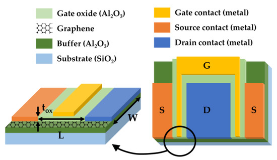 Sketch of the simulated GFET device described in [19]. On the left, an expanded view of the GFET gate region, corresponding to the circled area on the schematic view of the entire device, shown on the right.