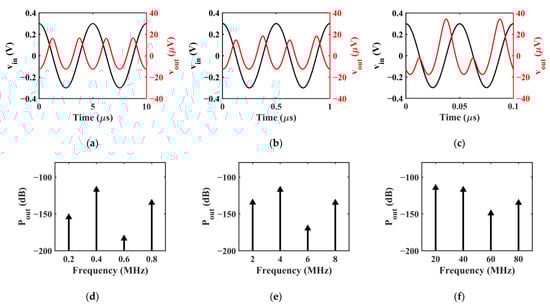 (a–c) GFET frequency doubler input and output voltage, vin(t) and vout(t), and (d–f) output power, Pout, computed at (a,d) fin = 0.2 MHz, (b,e) fin = 2 MHz, (c,f) fin = 20 MHz.