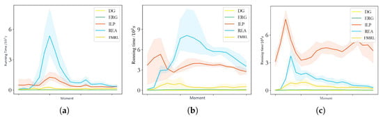 The Integer Linear Programming (ILP) algorithm and Reassignment algorithm (REA), due to their fundamentally different approaches and methods, can take up to eight times longer to run than the algorithm proposed in this paper. Additionally, changes in traffic conditions significantly impact the runtime of these two baseline algorithms. During peak hours, when orders flood in, the time consumption of these algorithms surges. Furthermore, the efficiency of the ILP algorithm is also constrained by the number of drivers, and the algorithm’s efficiency does not significantly improve even when there are fewer orders.
