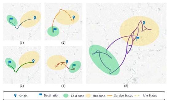The trajectory of a driver under different algorithms. (1) Distance-Based Greedy Algorithm; (2) Earnings-Ratio-Based Greedy Algorithm; (3) Integer Linear Programming Algorithm; (4) Reassignment Algorithm; (5) FMRL Algprithm.
