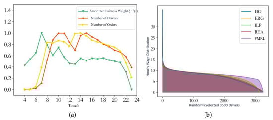 Figure 7b shows the hourly wages of 3500 randomly selected drivers. It is evident from the graph that the FMRL algorithm effectively ensures the fairness of driver income. Compared to other algorithms, the distribution by the algorithm proposed in this paper averages the income of the 3500 drivers, reducing the number of drivers with excessively high and low incomes.