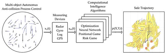 The system structure of safe multi-object control is considered, as shown in Figure 1. The current state of the multi-object autonomous anti-collision process control is monitored by measuring devices such as radar, gyro, log, and GPS.