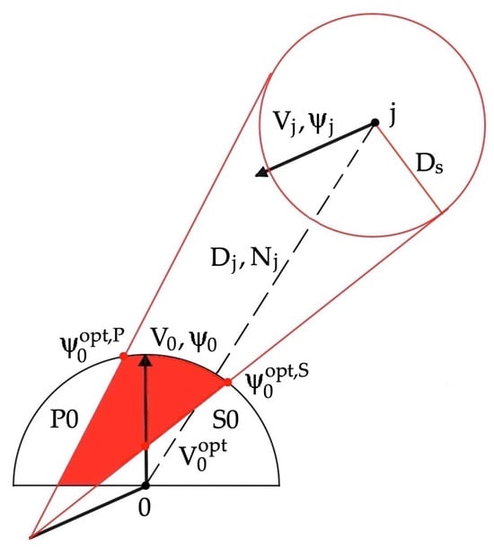 Object 0, moving with speed V0 and course ψ0 at a distance Dj and bearing Nj in relation to the encountered object j moving with speed Vj and course ψj, should pass it at a safe distance Ds. To achieve this, there are infinitely many possibilities of changing the course and speed from the set of permissible maneuvers to the port side of the P0 or to the starboard side of the S0; from this set, an optimal solution should be selected that ensures the maximum projection of the velocity vector in the given direction of movement of the object and leads to the smallest path losses during the safe avoidance of encountered objects [].