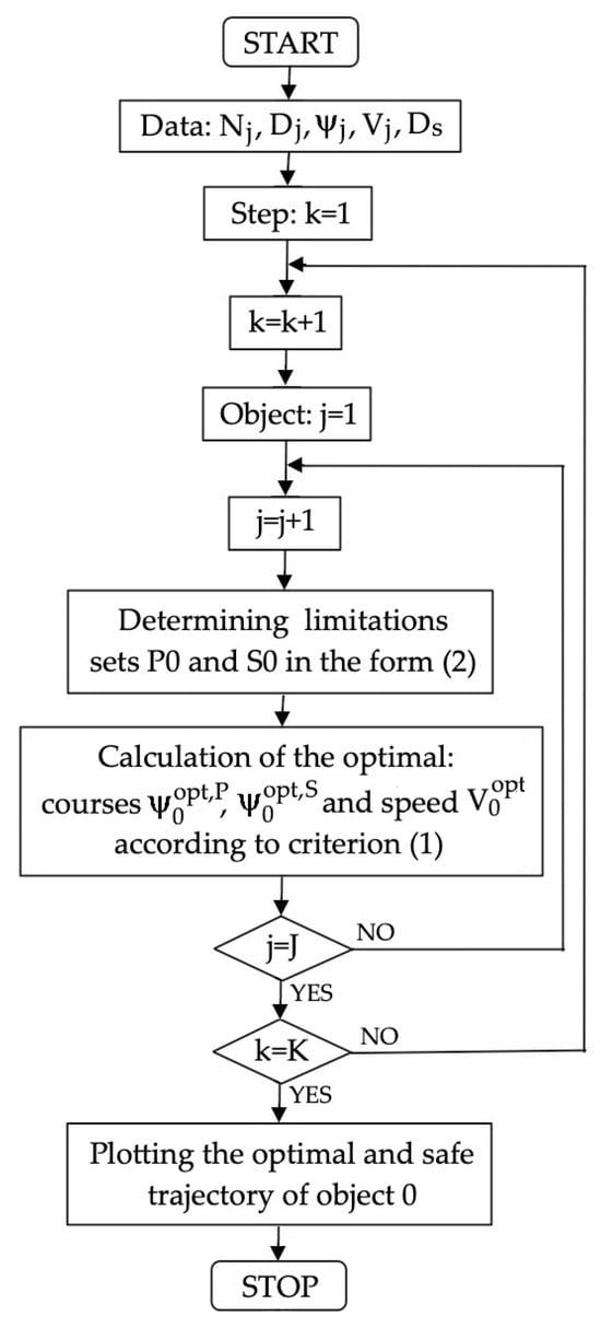 | BEGIN 1. Read Data: Nj, Dj, ψj, Vj, Ds 2. Step: k:=1 3. Object: j:=1 4. Determining limitations sets P0 and S0 in the form (2) 5. Calculation of the optimal: courses and speed according to criterion (1) IF not j = J THEN (j:=j + 1 and GOTO 4) ELSE k:=K IF not k = K THEN (k:=k + 1 and GOTO 3) ELSE Plotting the optimal and safe trajectory of object 0 END |