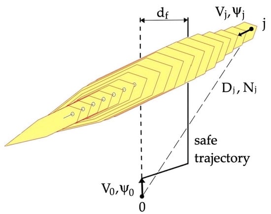 It is assumed that the encountered objects j move with a constant course ψj and speed Vj. The basis for the synthesis of individual safe multi-object control algorithms involves first determining the sets of course and/or speed changes that ensure the safe passing of the objects; these sets are presented in Figure 2.