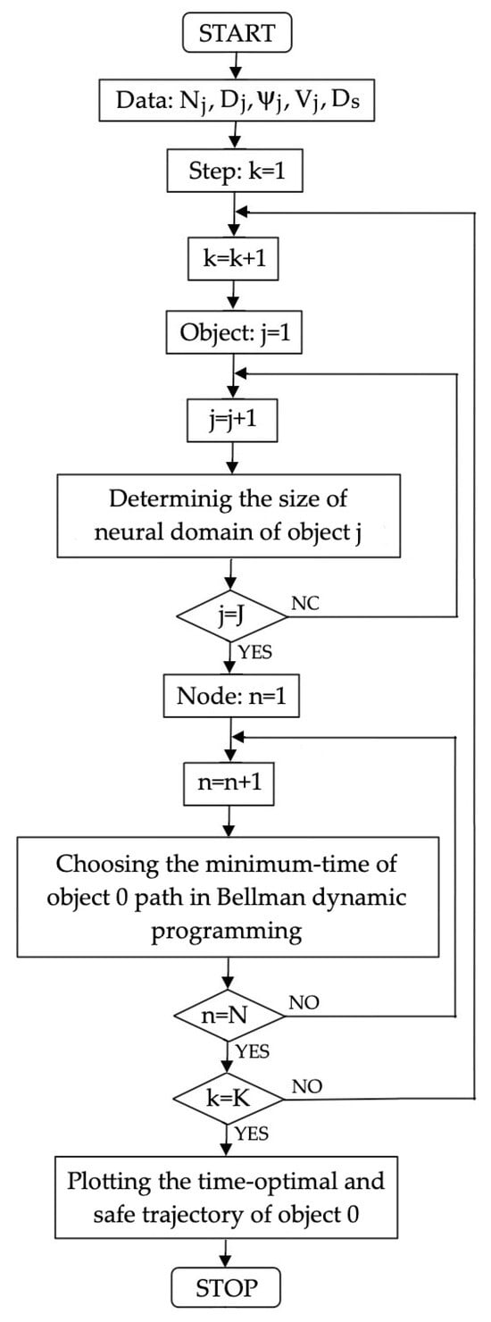 | BEGIN 1. Read Data: Nj, Dj, ψj, Vj, Ds 2. Step: k:=1 3. Object: j:=1 4. Determining the size of neural domain of object j IF not j = J THEN (j:=j + 1 and GOTO 4) ELSE Node: n:=1 6. Choosing the minimum-time of object 0 path in Bellman dynamic programming IF not n = N THEN (n:= n + 1 and GOTO 6) ELSE k:=K IF not k = K THEN (k:=k + 1 and GOTO 3) ELSE Plotting the time-optimal and safe trajectory of object 0 END |