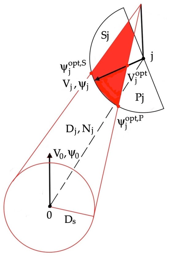 For example, in the navigation situation shown in Figure 6, in the case of a cooperative game, object j will choose the course ψjopt,S, while in a non-cooperative game it will choose the course ψjopt,P.