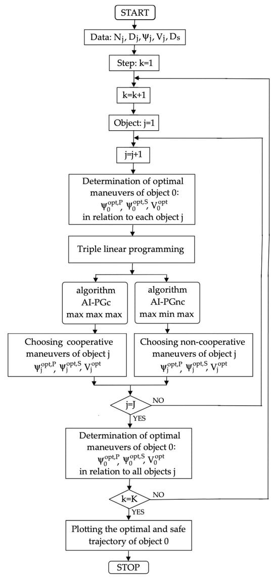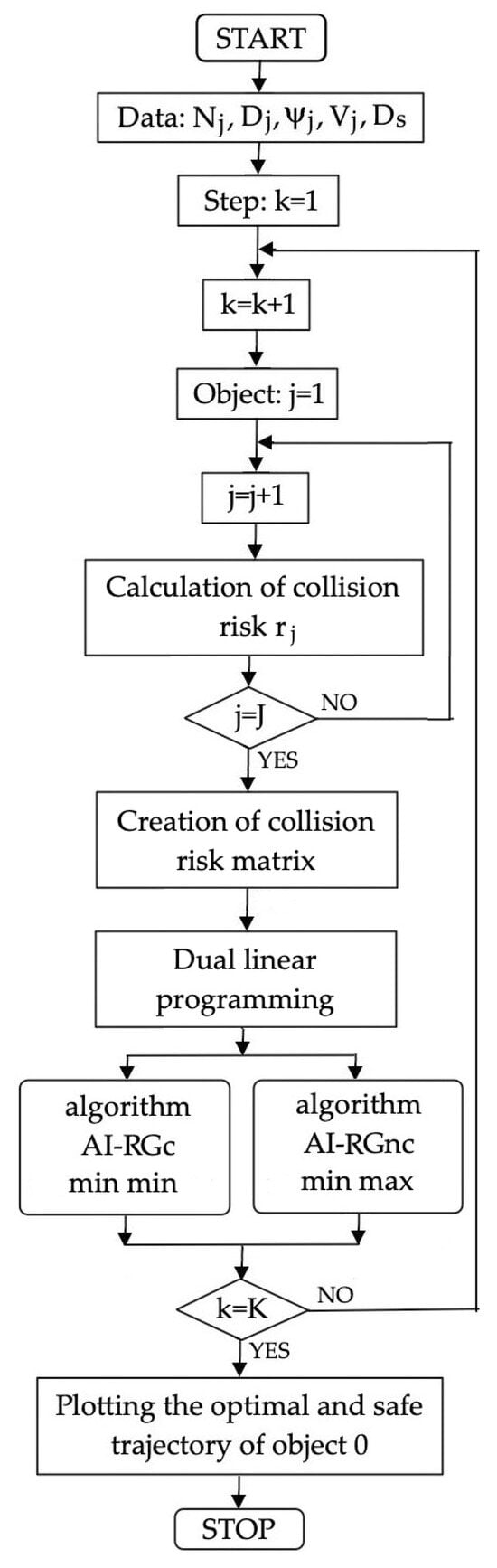 | BEGIN 1. Read Data: Nj, Dj, ψj, Vj, Ds 2. Step: k:=1 3. Object: j:=1 4. Calculation of optimal collision risk IF not j = J THEN (j:=j + 1 and GOTO 4) 6. Creation of collision risk matrix 7. Dual linear programming 9. Algorithm AI-RGc min min 10. Algorithm AI-RGnc min max IF not k = K THEN (k:= k + 1 and GOTO 3) ELSE Plotting the optimal and safe trajectory of object 0 END |
