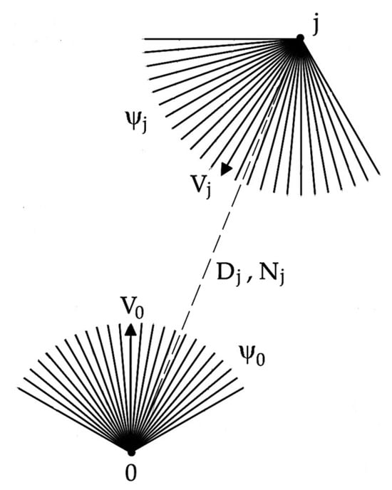 Maneuvering strategies (ψ0, V0) of object 0 and (ψj, Vj) of object j in the matrix game.