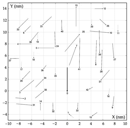 Illustration of the navigational situation of the object’s movement in relation to 42 other objects passed in the form of twelve-minute velocity vectors.