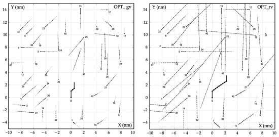 The optimal trajectories of the object 0, without artificial intelligence, during safe passing of 42 other encountered objects j: (OPT_gv) in good visibility, when Ds = 0.3 nm; (OPT_rv) in restricted visibility, when Ds = 1 nm.