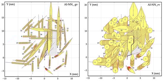 Optimal object 0 trajectories, using an artificial neural network, while safely passing 42 other encountered objects j: (AI-NN_gv) in good visibility, when Ds = 0.3 nm; (AI-NN_rv) in restricted visibility, when Ds = 1 nm.