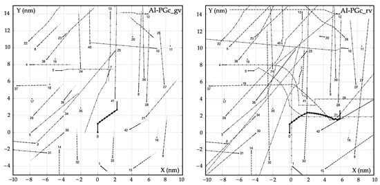 Optimal object 0 trajectories, using a cooperative positional game, while safely passing 42 other encountered objects j: (AI-PGc_gv) in good visibility, when Ds = 0.3 nm; (AI-PGc_rv) in restricted visibility, when Ds = 1 nm.