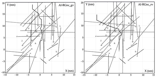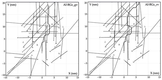 Optimal object 0 trajectories, using a cooperative risk game, while safely passing 42 other encountered objects: (AI-RGc_gv) in good visibility, when Ds = 0.3 nm; (AI-RGc_rv) in restricted visibility, when Ds = 1 nm.