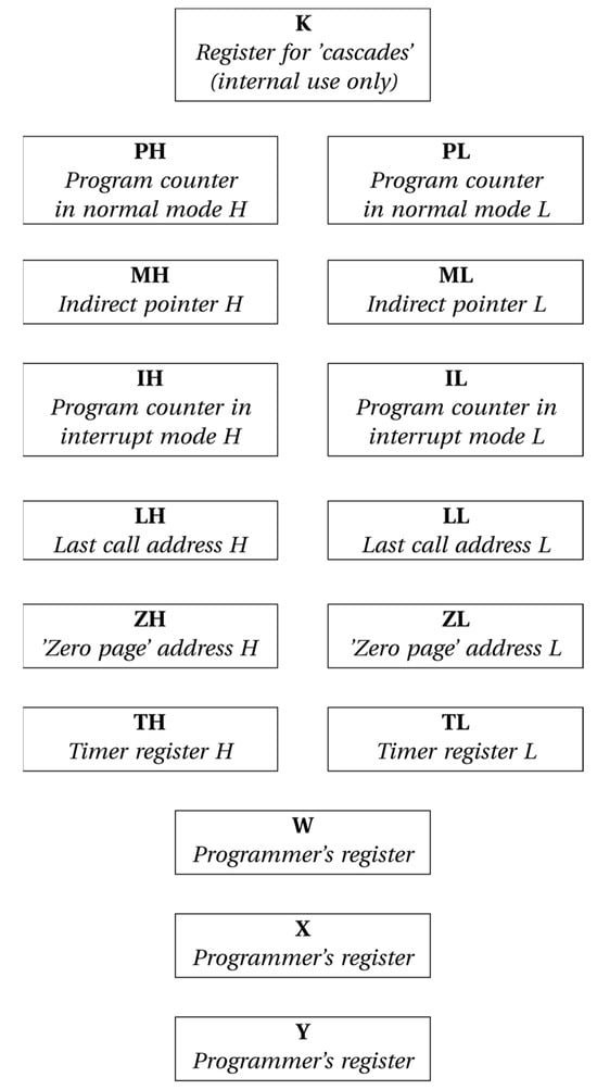- W, X, and Y: 8-bit single registers accessible to the programmers for reading and writing.