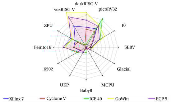 - Heinz, C.; Lavan, Y.; Hofmann, J.; Koch, A. A Catalog and In-Hardware Evaluation of Open-Source Drop-In Compatible RISC-V Softcore Processors. In Proceedings of the 2019 International Conference on ReConFigurable Computing and FPGAs (ReConFig), Cancun, Mexico, 9–11 December 2019; pp. 1–8. [Google Scholar] [CrossRef]