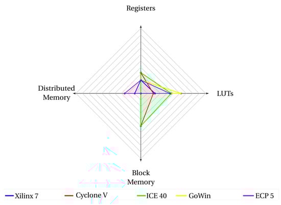 | FPGAs GoWin | LUTs Registers D. Memory B. Memory DSPs | 48 8 4 - - | 502 95 - 2 - | 1099 194 - - - | 1085 43 16 - - | 29 24 - - - | 285 151 - 1 - | 796 239 - 1 - |
