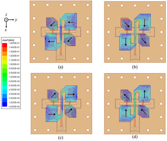 To better illustrate the antenna operating principle, the proposed antenna current distribution at 9 GHz over one cycle of time is shown in Figure 2. It shows that at the moment of t = 0 and t = T/2, the currents on the truncated patch, which is considered the E-dipole and the S-shaped patch, which forms the M-dipole, are along the diagonal direction and the y axis, while at the time t = T/4 and t = 3T/4, the current on the truncated patch is along the diagonal direction, and on the S-shaped patch, it is along the x direction. Therefore, two electric fields in orthogonal directions with T/4 delay time (90° phase difference) are generated. The currents are rotated in an anti-clockwise direction, which indicates that the proposed antenna has a right-hand circular polarization (RHCP) radiation.