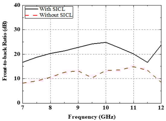 Comparison of the front-to-back ratio between the antenna designs with and without the SICL.