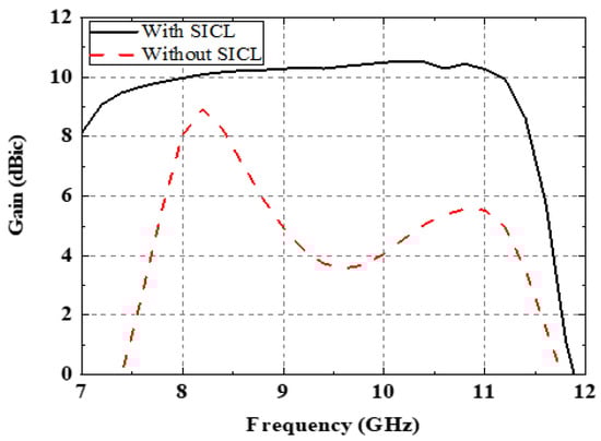 Comparison of the antenna gain between the antenna designs with and without the SICL.