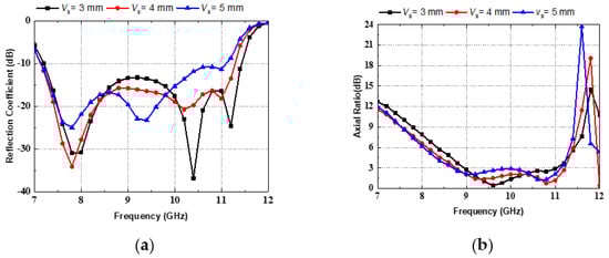 Parametric study of Vs. (a) Reflection coefficient. (b) Axial ratio.