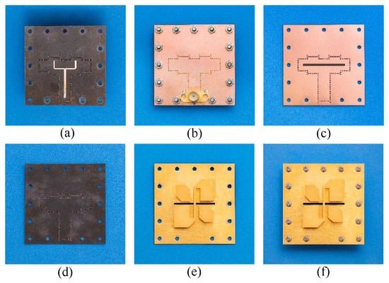 Fabricated prototype of the proposed antenna. (a) Top view of Substrate 1. (b) Bottom view of Substrate 1. (c) Top view of Substrate 2. (d) Bottom view of Substrate 2. (e) Top view of the copper layer. (f) Top view of the assembled antenna.