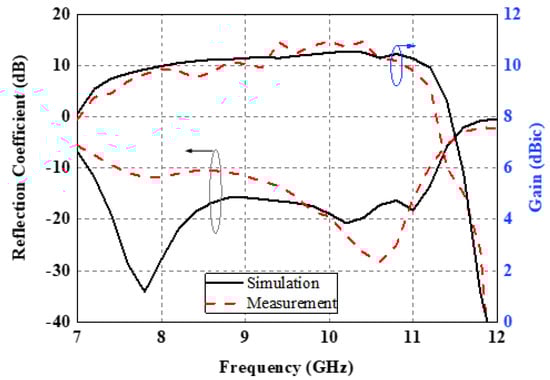 Simulated and measured reflection coefficients and gains of the proposed antenna.