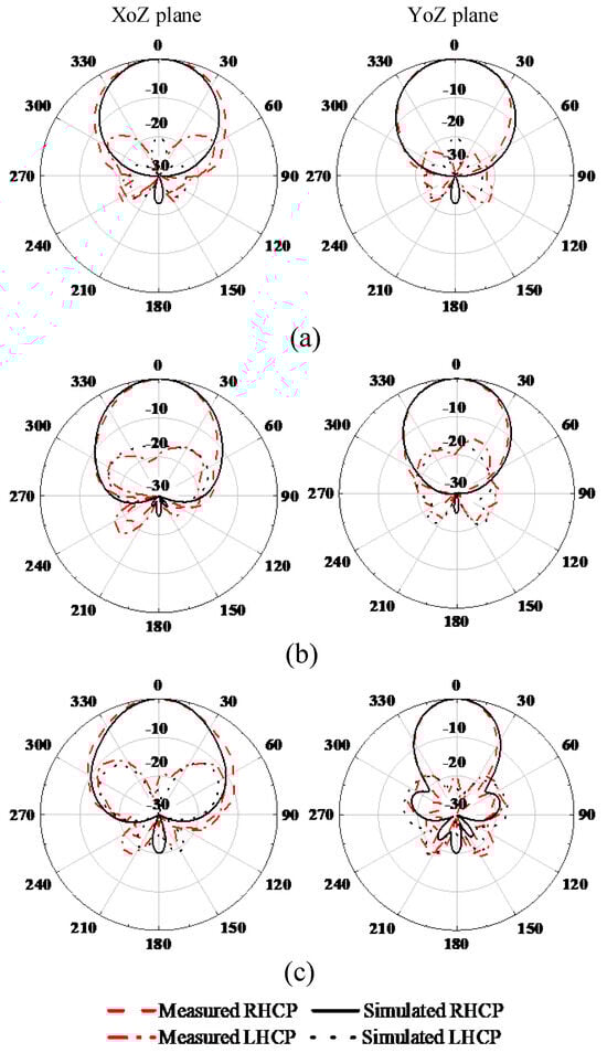 The radiation patterns in the two planes of the XoZ and YoZ planes are shown in Figure 12. The antenna achieves a stable RHCP radiation pattern with a low side lobe and backlobe. The cross-polarization discriminations are kept within −15 dB in regard to the polar angle from −30° to 30°. The front to back ratios of the radiation patterns are greater than 20 dB on both planes for the three selected frequencies.