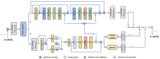 After undergoing the steps outlined above, the network is split into two branches []: the R branch and the G branch. The R branch is designed to generate M and A components, inversely transforming the input sRGB image to an RGB image. The G branch is designated for querying, decoding, and predicting W and , subsequently producing the sRGB image .
