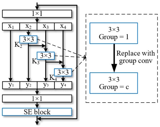 Integrating a multi-scale module into MSBN incorporates the Res2Net [] structure and SE block [], as illustrated in Figure 2. The Res2Net structure leverages grouped input feature maps in which each set of filters extracts features from a corresponding input group. This iterative process continues until all feature maps are processed. The resulting features are then concatenated and fused using 1 × 1 filters. As input features transform into output features, the equivalent receptive field expands, creating multiple feature scales through the combined effects of 3 × 3 filters. Simultaneously, the SE block enhances the model’s attention mechanism and adaptively re-calibrates channel-wise feature responses by explicitly modeling inter-dependencies among channels. This synergistic approach enhances the model’s capacity for sophisticated multi-scale feature extraction, contributing to its academic robustness.