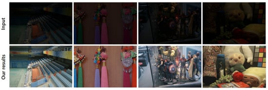 We used the PyTorch framework on an NVIDIA 4090 GPU to train our model for 250 epochs on the LOL-V2-real dataset []. LOL-V2-real contains 689 low-/normal-light image pairs for training and 100 pairs for testing. This dataset comprised images from both indoor and outdoor scenes, each with a resolution of 600 × 400. To optimize MSBN, the Adam optimizer was chosen with an initial learning rate set to , accompanied by a weight decay of . To enhance the model’s generalization and reduce the risk of overfitting, a data augmentation strategy was employed. In addition to the original images, the model was fed with horizontally and vertically flipped versions of the original images, enriching the dataset. This strategy significantly boosted the model’s performance during both the validation and testing phases. Through experiments, remarkable improvements were observed in image quality and restoration accuracy for the low-light enhancement task. As depicted in Figure 3, the visual results demonstrate the effectiveness of our method in enhancing image details and overall image quality under low-light conditions.
