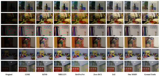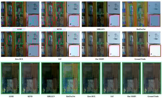 We compared the enhancement effects under low-light conditions of the MSBN method with several other methods [,,,,,,,]. As depicted in Figure 4, it became apparent that Zero-DCE [] faces significant challenges when operating in low-light environments, as evidenced by its performance. The image processing results frequently yielded a perceptually darker visual representation of the images. In contrast, RetiNexNet [] exhibits a notable issue primarily related to color restoration. It shows pronounced color discrepancies that may distort the authentic colors of objects in the image, thereby compromising image quality and fidelity. The IAT [] exhibits a performance that approximates the ground truth to a greater extent than its predecessors; however, it is plagued by pronounced noise artifacts. In contrast, our method not only surpasses the IAT in terms of reduced noise but also yields clearer and more visually distinct images. Through a comparative analysis of the output images from each model, our method outperforms other models in processing low-light images. It not only significantly improves the brightness and clarity of the pictures but also makes the enhanced images more akin to real scenes.
