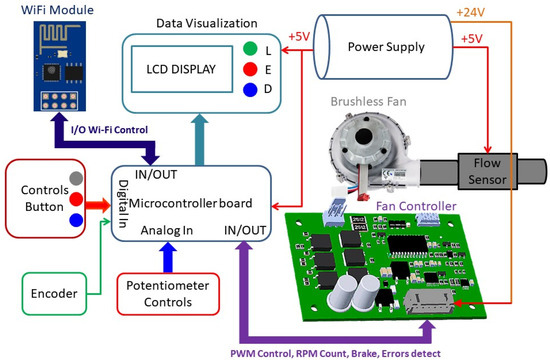 Designing the hardware for a non-invasive ventilation system involves careful consideration of various components and functionalities to ensure the device’s effectiveness, safety, and reliability. Specific details may vary based on the intended use and technology involved. The NIV device proposed in this study was designed according to the scheme shown in Figure 1. Its operation is based on the generation of multi-level positive pressure at two levels and predetermined levels, calibrating the airflow according to the phase of inspiration/expiration. The microcontroller can implement control algorithms that produce positive airway pressure levels (such as IPAP and EPAP in BiPAP) based on sensor inputs [31]. The microcontroller can facilitate communication between the NIV device and external systems. This could include data logging, remote monitoring, and connectivity with other medical devices in the hospital environment. The proposed scheme is also equipped with a central control system that receives data from the ventilator, providing functional information remotely via a Wi-Fi connection. Possible causes of ventilator failure can be inadequate volume delivery, airflow generator overload, the failure of some parts of its controller, and overtemperature [32,33,34].