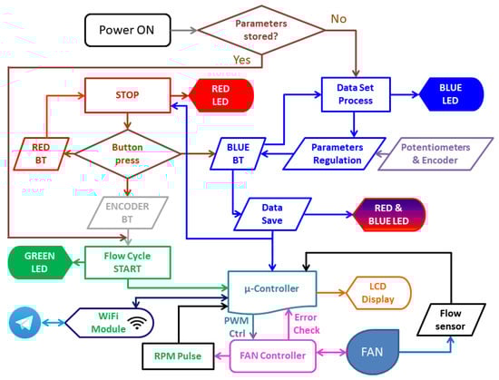 Programming a microcontroller for an NIV system involves writing code that controls the operation of the hardware components, reads sensors, and ensures the safe and effective delivery of ventilatory support. The microcontroller operates independently following an instruction set from a predefined algorithm according to the flowchart reported in Figure 3.