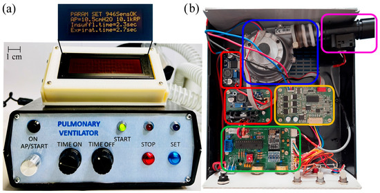 NIV. (a) Front panel of the proposed NIV. (b) Internal view of the NIV in which the turbine is evidenced in blue, red boxes include the power supply units, yellow box shows the turbine controller, and green box highlights the microcontroller board.