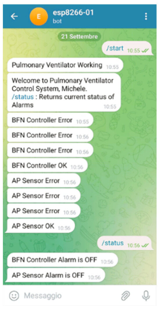 The NIV prototype was mounted in a commercial container using 3D-printed features. The main power switch, three control knobs, control buttons, and control LEDs are located on the front panel, while the LCD, with 4 lines of 20 characters each, is located on the top cover. The proposed NIV is equipped with sound and light indicators to better monitor its functioning to facilitate the supervision of the activity. The integration of the ESP8266 ESP-01 Wi-Fi module allows the device to connect to Wi-Fi networks, facilitating signal exchanges with the microcontroller. The logic connection between the Wi-Fi module and the microcontroller is made via a series of level shifters to adjust the signals operating at two different voltage levels (3.3 V for the Wi-Fi module and 5 V for the microcontroller). This allows the fan to receive/send commands or requests directly from a smartphone, improving the management and customization of settings. In addition, to ensure optimal remote control, a remote monitoring system is implemented using the Telegram app. With this solution, the NIV ventilator’s status can be viewed in real time, providing an intuitive interface for monitoring and controlling operations. The ESP8266-01 Wi-Fi module, interfaced with the microcontroller, allows a smartphone to be employed via the Telegram application, for which a dedicated BOT was developed. After start mode, the module enters router mode, providing a Wi-Fi network named AutoConnectAP, which is used to log in and check the connection status (e.g., the module management, or the SSID data of the Internet network) [44,45,46]. Once the connection parameters have been stored, the device must be restarted, and the module then instantly connects to the network without entering server mode again. If the device is transferred to another location, the module will not find the stored network by turning on the device and will go back to router mode for the replacement of the SSID parameters. Once the parameters are provided, the module connects to the selected network. By activating the BOT, the operator can manage the NIV operation status. Each time the device is turned on, the module sends a START message to the operator. During operation, the operator can receive two possible error messages in the event of a failure in the turbine or flow sensor. If the error is promptly fixed, a confirmation message is sent. The operator can send a status request and immediately receive a confirmation message regarding the correct operation of the device at any time. Figure 5 shows all the messages and commands currently provided by the app. The connection between the ESP8266 module and the ATmegar328P-PU microcontroller is a bidirectional serial communication, with which it is possible to control the NIV via the Telegram APP by making some minimal hardware and software implementations, sending commands that can be useful in safety matters. For example, the turbine controller is equipped with a BRAKE input, connected to the ATmega328P-PU microcontroller, which can instantly stop the turbine for a few seconds in an emergency by sending a digital signal. The remote-control functions of both STOP, to put the NIV in a resting state, and START, to restart the respiratory cycle with preset parameters, are easily implemented. Replacing the current ESP8266 module with a more extended version could also provide total remote control of the NIV, adding, for example, the ability to set operating parameters and store them in the EEPROM of the ATmega328P-PU.