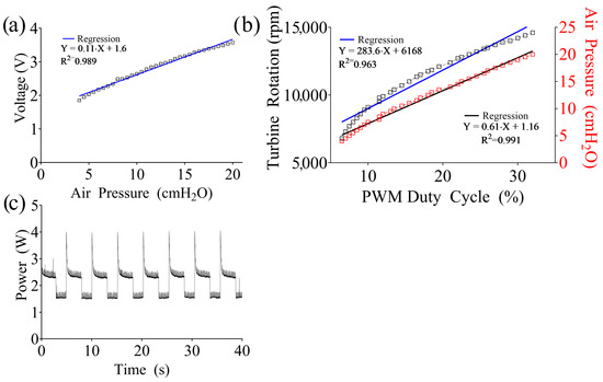(a) Calibration of the flow sensor output voltage compared with air pressure. (b) Turbine rotational speed vs. PWM duty cycle. (c) Power consumption in running mode.