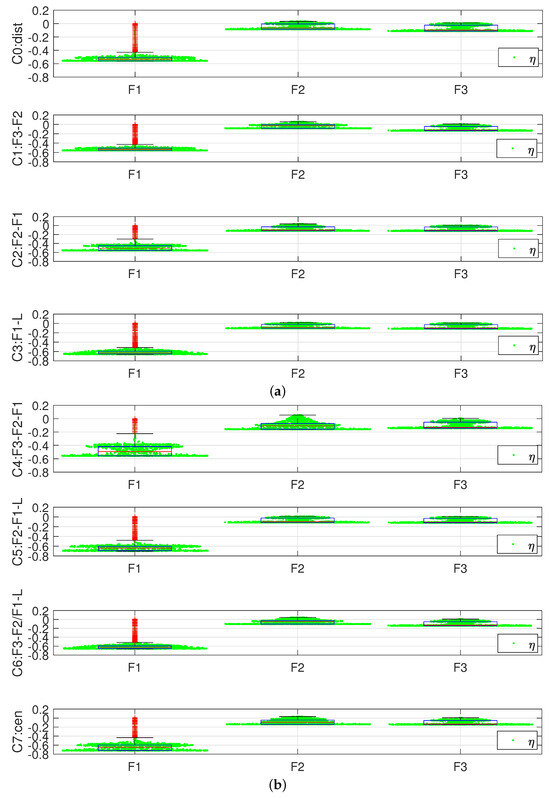 For a better understanding, for each follower vehicle, the mean value of the index is computed (denoted with , , and , for vehicles F1, F2, and F3, respectively), together with the overall mean value for each topology (denoted with ). For computations, the Matlab function mean was used. The results are given in Table 1 and show that the coalitions between adjacent vehicles improve the stability of the platoon, with respect to the default case, i.e., coalition C0, which can be viewed as each vehicle working independently in a distributed manner. See, for example, the numerical values for C1, in which a coalition between vehicles F3 and F2 is formed. Since F3 initialized the coalition, the corresponding value is improved (since −0.0925 < −0.0711). A smaller index can be viewed as a more stable vehicle because it is further from the stability limit, which is the zero value. As expected, the centralized coalition C7 has the smallest overall index (is the most stable), whereas the default coalition C0 has the largest value.