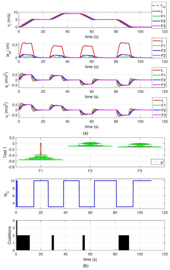 Simulation results for the proposed C-DMPC strategy obtained in Test 1. (a) Test 1—velocity trajectories (1st subplot), position error trajectories in absolute value (2nd subplot), acceleration trajectories (3rd subplot), and control input trajectories (4th subplot). (b) Test 1—stability condition index (1st subplot), parameter values (2nd subplot), and coalition selection (3rd subplot).