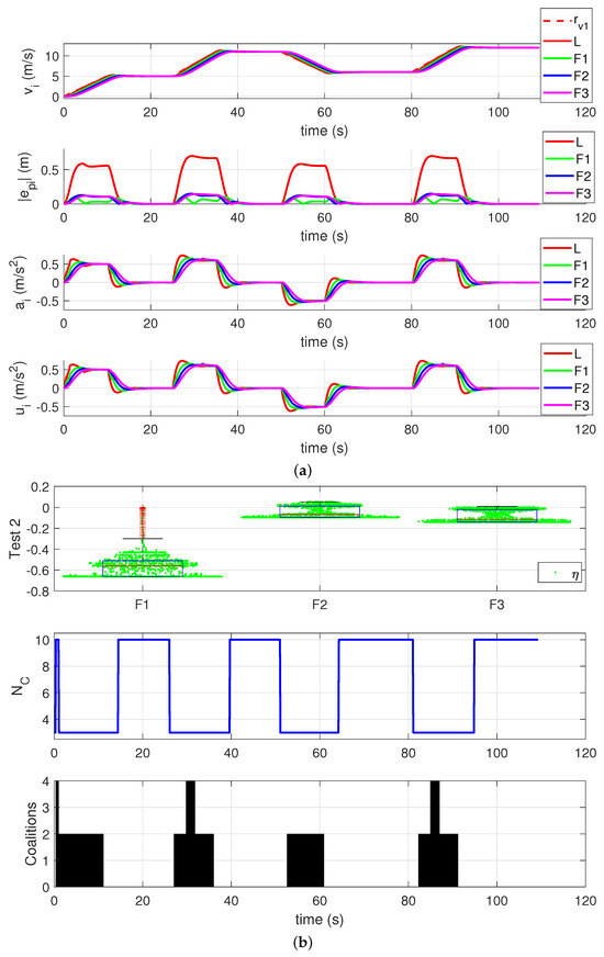 Simulation results for the proposed C-DMPC strategy obtained in Test 2. (a) Test 2—velocity trajectories (1st subplot), position error trajectories in absolute value (2nd subplot), acceleration trajectories (3rd subplot), and control input trajectories (4th subplot). (b) Test 2—stability condition index (1st subplot), parameter values (2nd subplot), and coalition selection (3rd subplot).