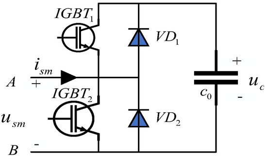 MMC’s basic unit is SM. Its standard structures include the half-bridge type and full-bridge type. In engineering, a half-bridge SM is commonly employed, consisting of two insulated gate bipolar transistors (IGBTs) and a capacitor, as demonstrated in Figure 1.