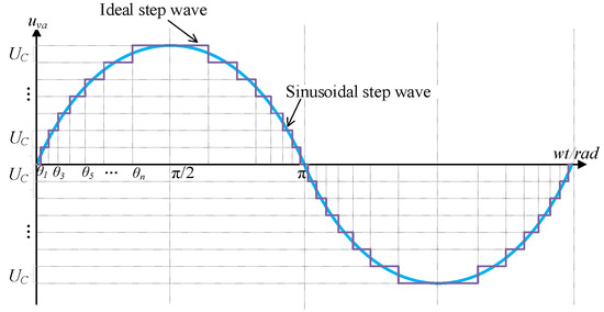 From Figure 5, we can see that the step wave varies with the sinusoidal modulated wave and gradually approaches it. Each arm contains N SMs. Each SM has a capacitor value and voltage of C0 and UC, respectively. For phase j, the number of conductive SMs in the upper- and lower-bridge arms are npj and nnj, separately. According to the modulation strategy, the number of conductive SMs n in each bridge meets 0 ≤ n ≤ N. Then, npj, nnj, satisfy the following relation:
