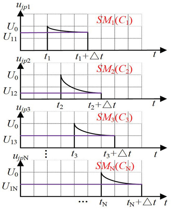 As seen in Figure 6, ideally, C1 = C2 = C3 = …= CN causes the SMi(i = 1, 2, 3…N) to have a matching discharge rate to K. After modulation, the SMi(i = 1, 2, 3…N) still maintains equal capacitor voltage, the same discharge power, and balanced stored energy. However, in actual engineering, the SM capacitor values are not exactly alike; for example, C1 ≠ C2 ≠ C3 = … = CN. At this time, according to the theoretical on-time△t, the actual SMi(i = 1, 2, 3…N) discharge schematic is shown in Figure 7.