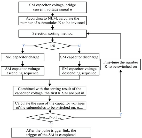 In engineering applications, the NLM modulation strategy requires the collaboration of SM capacitor voltage sequencing to decline the bridge SM capacitor voltage imbalance. The specific control process is shown in Figure 8.