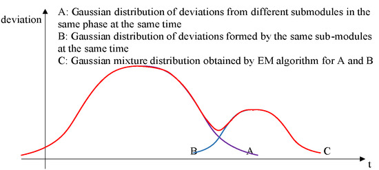 In actual operation, the SM capacitor parameters are not the same, making the SM charging and discharging rates differ, resulting in a deviation between the virtual and theoretical values for the capacitor voltage and causing an imbalance in the SM stored energy. Therefore, assessing the capacitor voltage error is necessary to establish a mixed Gaussian deviation distribution and estimate the deviation compensation value. The construction process for the mixed Gaussian distribution is shown in Figure 11.