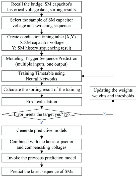The time series prediction technique is implemented based on historical values to forecast the SM capacitor voltage and arm current in real time. The mixed Gaussian distribution of the capacitor voltage offset is developed, and the compensation voltage is calculated. The usual sorting method is used to produce the trigger sequences, regarded as a sample to train the neural network. Then, the prediction of the SM trigger sequence and the completion of the control are achieved by uniting the anticipated values for the SM capacitor voltage, the arm current, and the compensation value for voltage deviation.